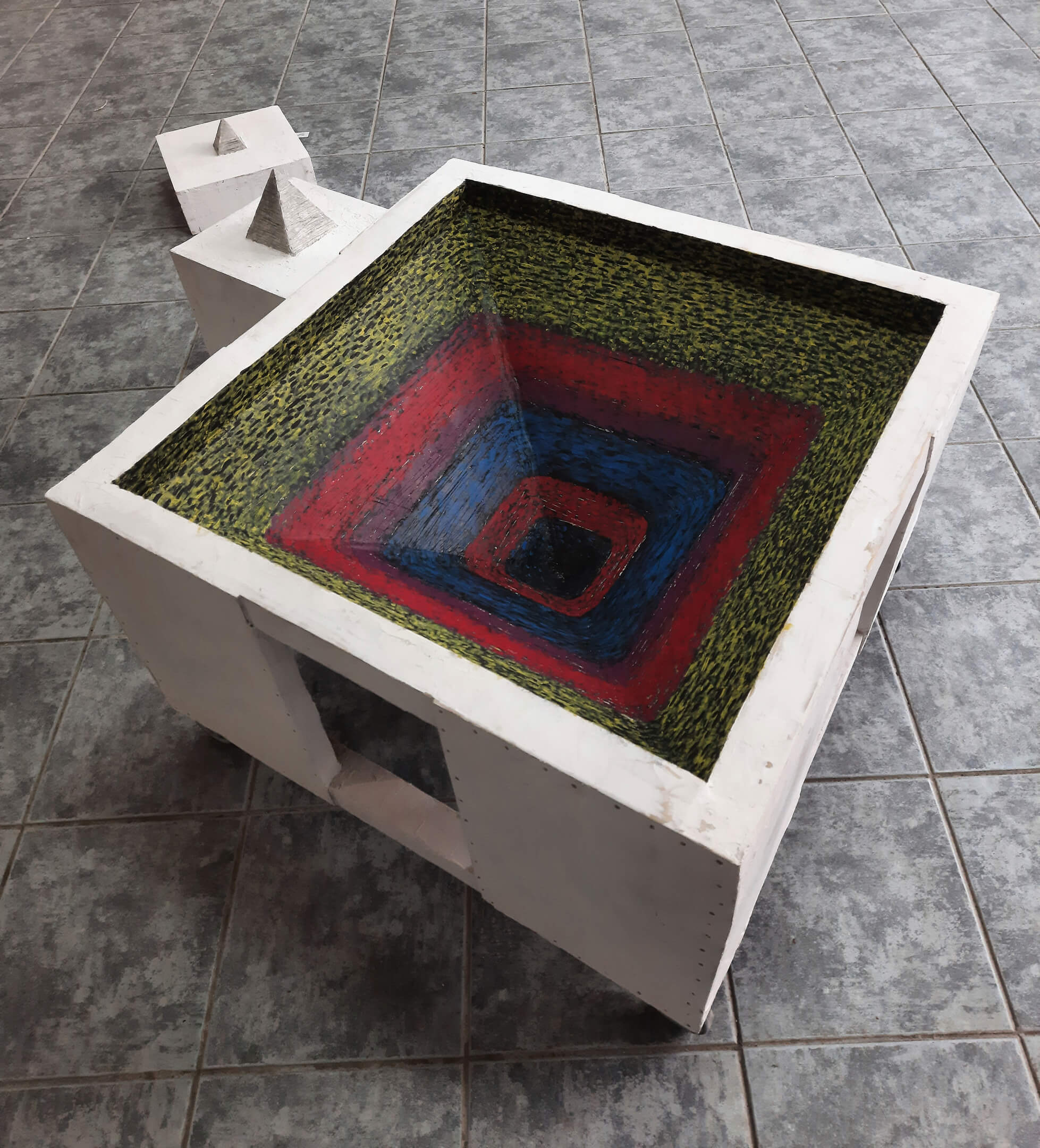 Obiectul expus reprezintă unul din multele instrumente pe care le folosesc să decontextualizez diferite momente prin care trec eu însumi.  Scot piesele că dintr-un joc și le aranjez dându-le astfel un nou înțeles.Pornesc de la piramide cum e cazul acestor piese și le recompun într un alt ansamblu care formează și nuanțează subiectul în direcția în care doresc eu. Vorbesc despre spațiu ,vorbesc despre culoare ,vorbesc despre căutare, vorbesc despre a reconstrui.Folosesc  lemn, răsini și în general resturi, materiale nepretioase. Modestia materialelor lor  mă face să fiu mai în largul meu și să mă concetrez pe jocul conceptelor. Câteodată chiar sunt surprins de ceea ce găsesc în mod aleatoriu și însăși  descoperirea lor  poate devine un start spre o nouă direcție de cercetare și creație.